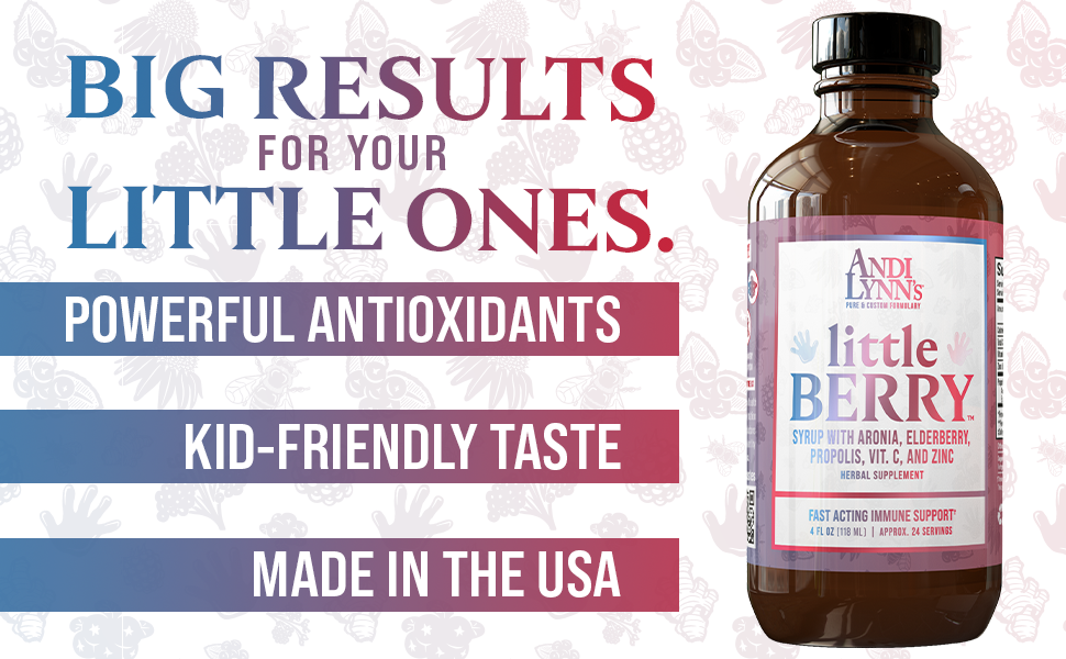 Fast acting immune support syrup with aronia, elderberry, propolis, vitamin C, and zinc. Immune Booster for Kids: Andi Lynn’s LittleBerry is a family-friendly superfruit and herbal supplement made in the USA for kids immune support, full of powerful antioxidants.Berry Benefits: Elderberry defends the body from attacks and promotes faster recovery.