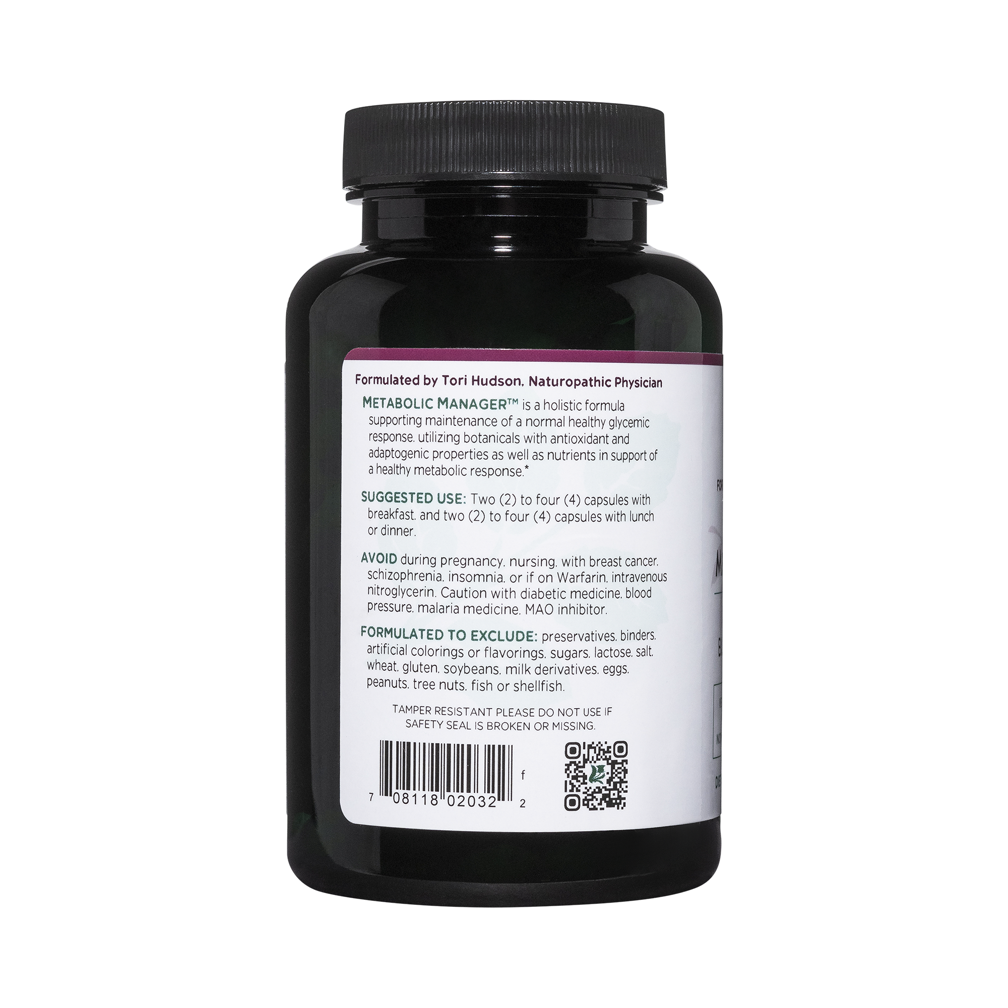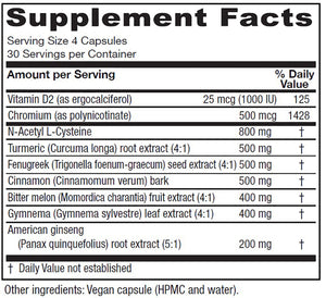 A holistic formula supporting the maintenance of a healthy glycemic and metabolic response. This formula combines nutrients and botanicals rich in antioxidant and adaptogenic properties.*SERVING SIZE: 4 Capsules SERVINGS PER CONTAINER: 30 INGREDIENTS: Vitamin D2 (ergocalciferol), Chromium (polynicotinate), N-Acetyl L-Cysteine, Turmeric root extract (4:1), Fenugreek seed extract (4:1), Cinnamon bark, Bitter Melon fruit extract (4:1), Gymena leaf extract (4:1), American Ginseng root extract (5:1)Other Ingredients: Vegan Capsule (HPMC and water).DIRECTIONS: Take Two (2) to four (4) capsules with breakfast, and two (2) to four (4) capsules with lunch or dinner.