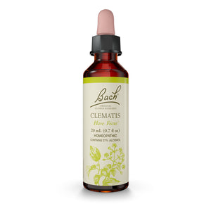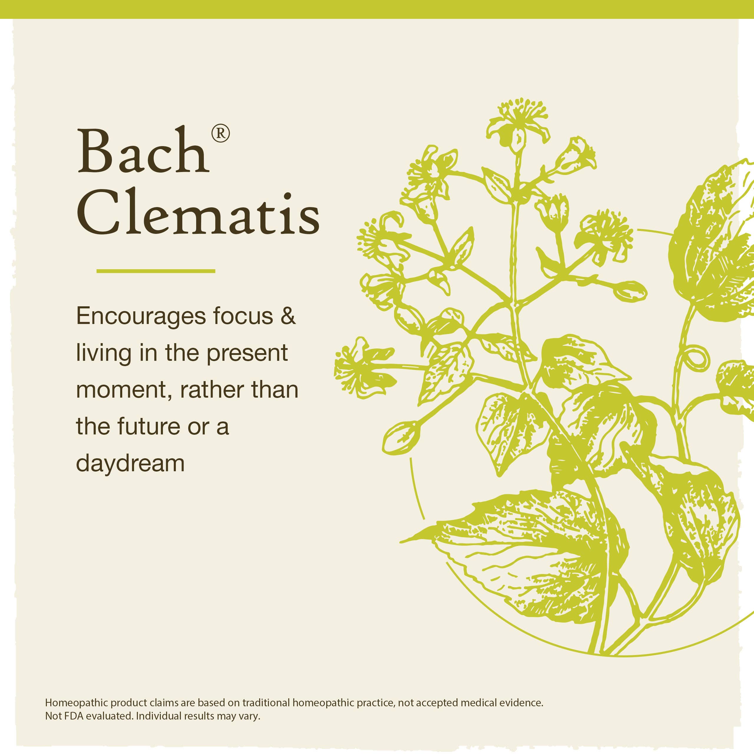 Bach Original Flower Remedies, Clematis, Have Focus 0.7 fl. oz. (20 ml). Have focus. Homeopathic Bach Clematis Flower Essence encourages the positive potential to be present and stay focused on the task at hand. Trusted worldwide for 85+ years: Developed by Dr. Edward Bach, the 38 Remedies each correspond to a different emotional state, and together form a holistic system to support emotional wellness. Original & authentic: As the only brand endorsed with Dr. Bach's signature and only maker authorized by the Bach Centre, flowers are still hand-picked from the original gardens in the UK. Doctor developed formula: Plant-based active ingredients, vegan, vegetarian, non-habit forming. FREE OF: Artificial flavors/colors, sugar, gluten, major allergens. Personalized approach to wellness: Take 2 drops in mouth or add to water and sip, repeat as desired. Up to 7 remedies may be taken together to make your own blend. Approximately 380 doses per bottle