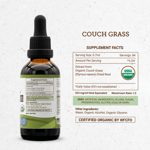 Couch Grass, a trusted herb in traditional wellness practices, is known for its soothing properties that promote urinary comfort and support kidney health. This tincture provides a natural way to maintain balance and vitality in urinary function. Couch Grass Tincture supports healthy kidney function, promotes natural detoxification, and contributes to overall urinary tract wellness with its bioactive and calming compounds. Couch Grass contains: polysaccharides, mucilage, silica, and essential phytonutrients. Our Couch Grass Tincture is crafted using high-quality ingredients and a gentle extraction process to preserve potency and nutrients. Produced in an FDA-registered, GMP-certified facility, our tinctures are third-party lab tested, vegan, cruelty-free, and proudly made in the USA.