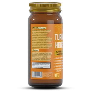 Handcrafted and made in the USA, our Turmeric Multifloral Honey Infused Superfood Blend is a revitalizing fusion of potent ingredients sourced from natural products. Designed to invigorate your senses and support overall wellness, this blend features the vibrant essence of Turmeric Powder, the kick of Ginger Powder, and the nourishing qualities of Black Seed Powder.*