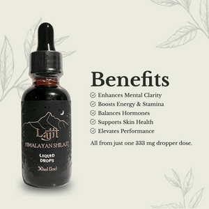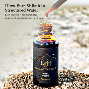 Each dropper full is 333mg of Shilajit suspended in purified structured water. Conveniently electrify your day the Lajit way with our new Liquid Drops.