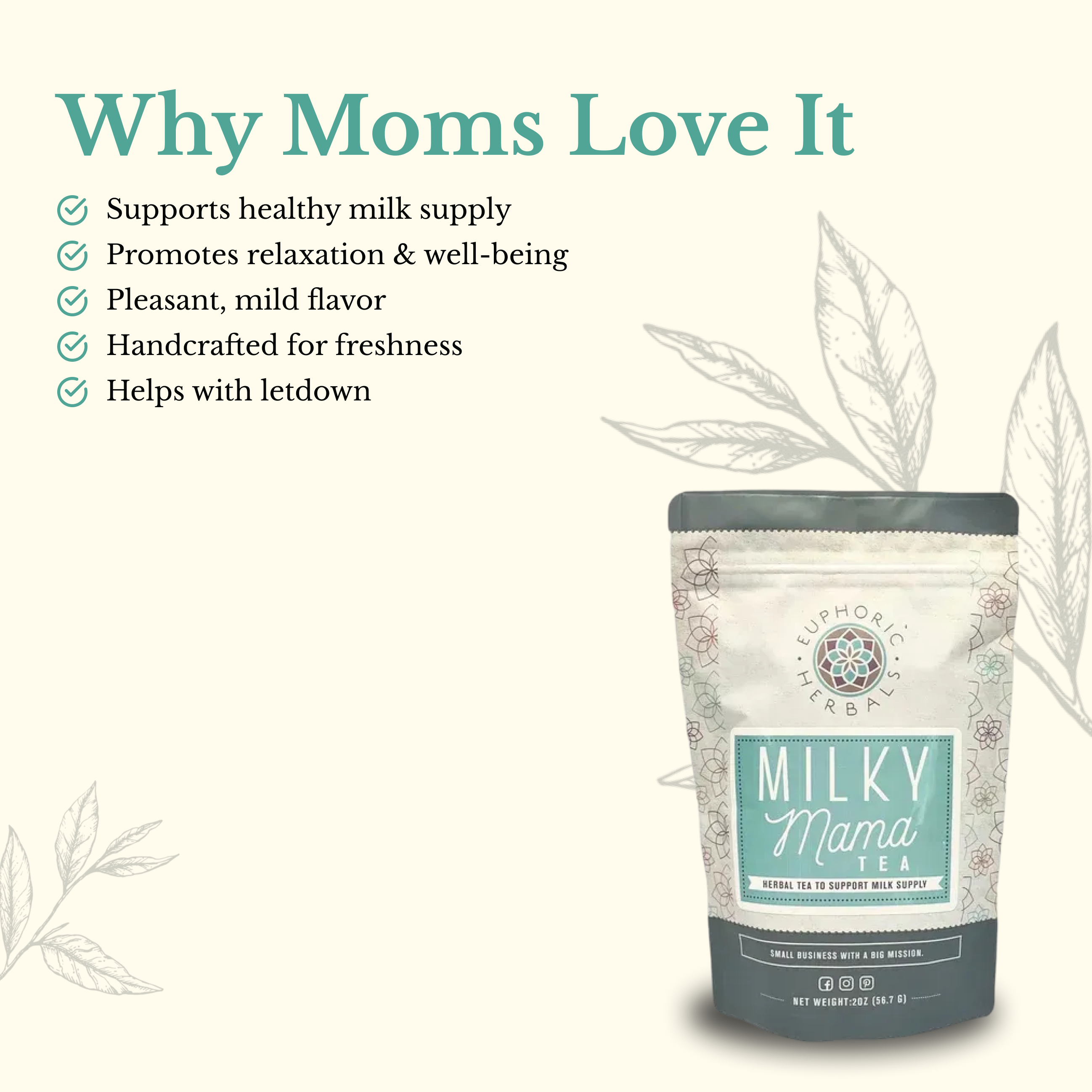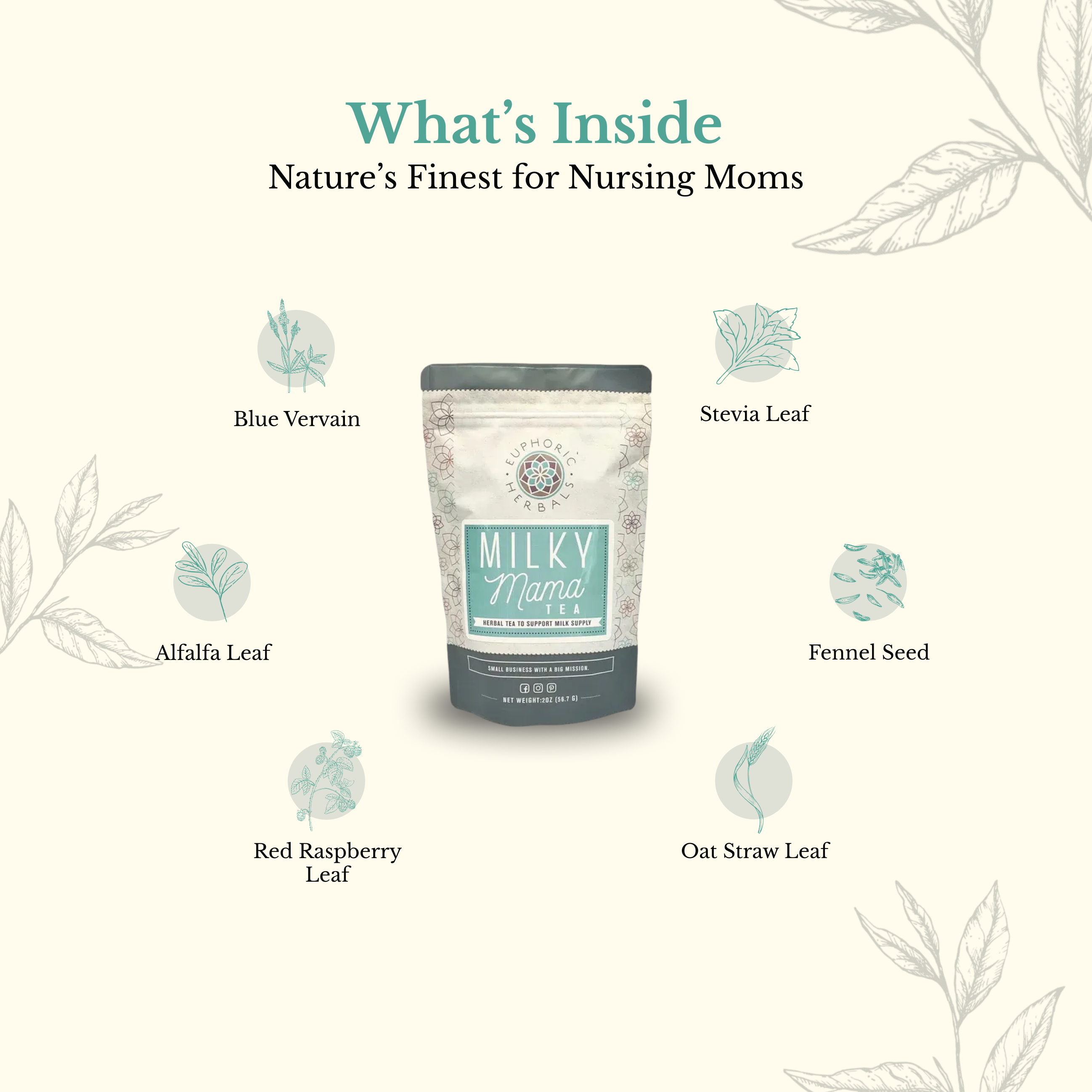 Milky Mama is meticulously crafted to ensure that every sip delivers a harmonious blend of herbal goodness, offering a moment of serenity in the midst of a busy day.Organic Ingredients: Red Raspberry Leaf, Alfalfa Leaf, Fennel Seed, Blue Vervain, Oat straw Leaf, Citrus Peel and Stevia Leaf.