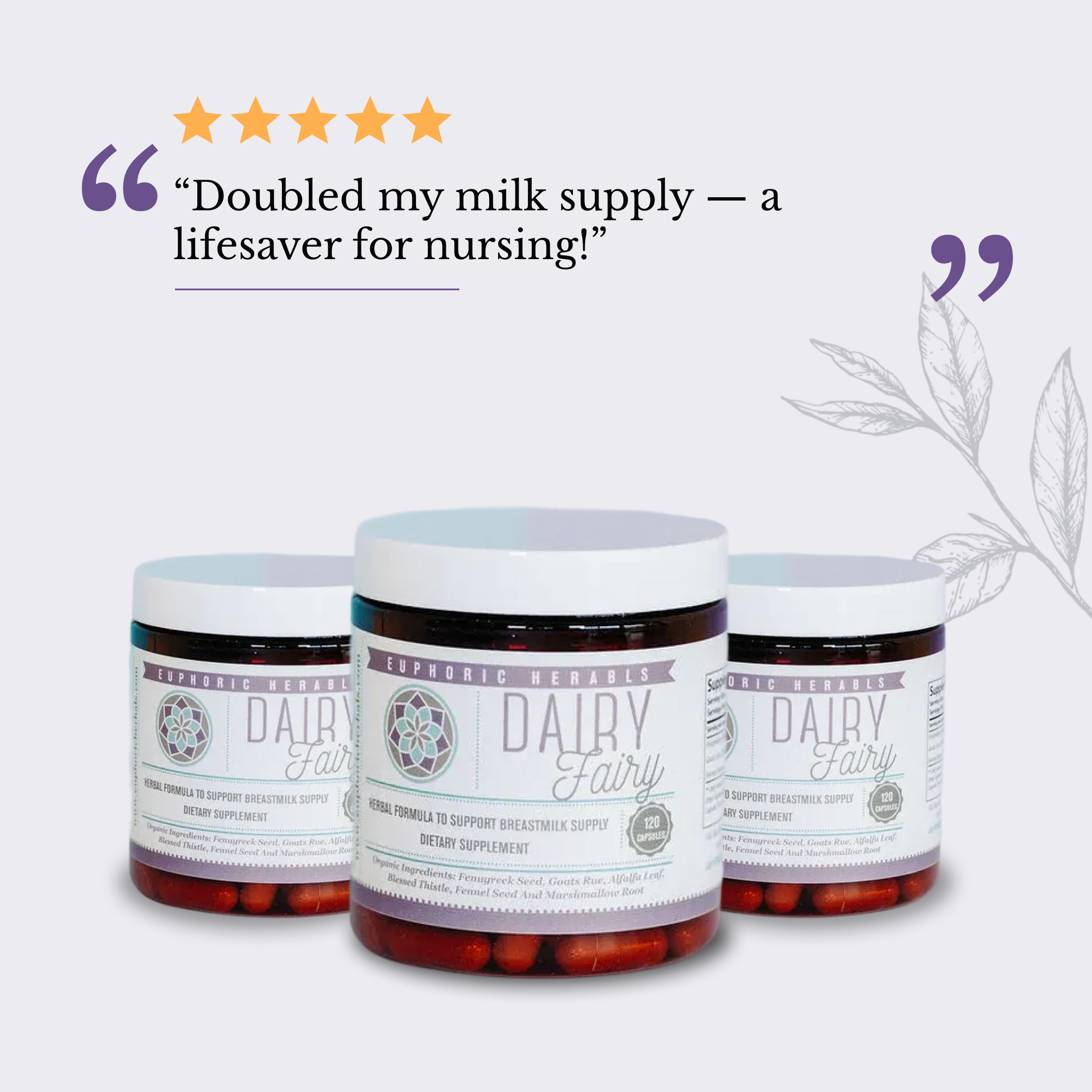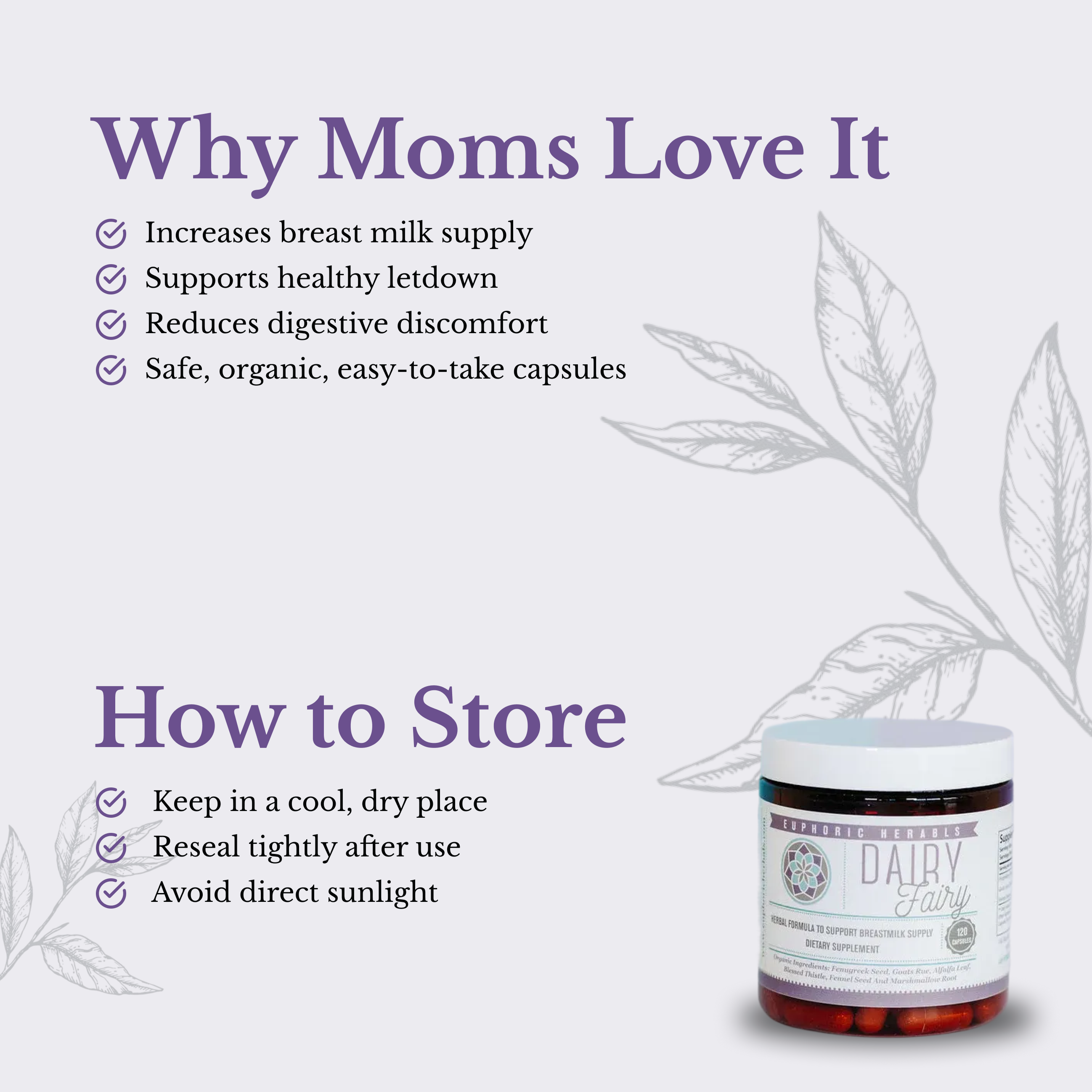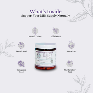 🌿 Blessed Thistle acts as a potent galactagogue, further stimulating the production of breastmilk. Lastly, Alfalfa Leaf provides essential nutrients, vitamins, and minerals, supporting overall maternal well-being.By incorporating Dairy Fairy into your daily routine, you can experience the benefits of increased breastmilk supply, allowing you to provide the best nourishment for your baby. Our easy-to-take capsules are convenient and hassle-free, making it simple to integrate them into your busy lifestyle.