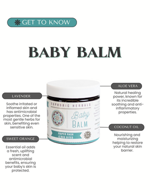Baby Balm Salve, a multitasking miracle worker made with 100% organic ingredients, designed to soothe your baby's most common skin ailments. This gentle, yet potent balm offers relief from diaper rash, cradle cap, and pesky mosquito bites. Our Baby Balm Salve is carefully crafted with love and expertise, bringing the power of nature directly to your baby's skin. Use it with confidence, knowing your little one is getting the purest care that Mother Nature has to offer.