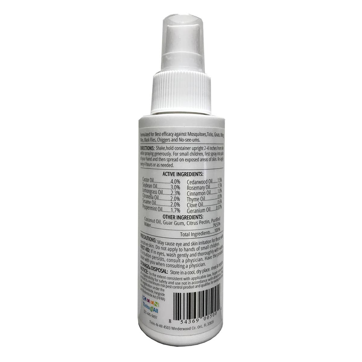 Formulated with natural ingredients to repel ticks and other insects for up to 4 hours. This specialty blend consist of 11 active ingredients: castor oil, sesame oil, cedarwood oil, lemon grass oil, soybean oil, rosemary oil, peppermint oil, citronella oil, thyme oil, clove bud oil, and geranium oil.
