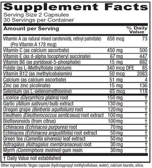 For overall immune support, this robust formula combines scientifically based and traditionally used herbal and nutrient ingredients to promote maintenance of good health.*SERVING SIZE: 2 Capsules SERVINGS PER CONTAINER: 30 INGREDIENTS: Natural mixed carotenoids, retinyl palmitate (Vitamin A), calcium ascorbate (Vitamin C), d-alpha tocopheryl succinate (Vitamin E), pyridoxal-5-phosphate (Vitamin B6), L-Methylfolate calcium (Folate), methylcobalamin (Vitamin B12), calcium ascorbate (Calcium), zinc picolinate (Zinc), L-selenomethionine (Selenium), Licorice root, Garlic bulb extract, Oregon grape root, Eleuthero root extract, Bioflavonoids (from citrus), Echinacea root, Echinacea root extract, Green tea leaf extractm Astragalus root, Myrrh gum resin.Other Ingredients: Vegan Capsule (HPMC and water), calcium laurate, and silica.DIRECTIONS: Take 2 capsules, 1-3 times daily. Also suitable for men