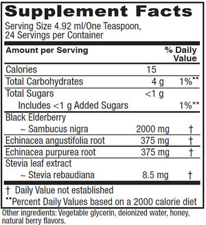 Elderberry has a long tradition and also modern scientific research demonstrating an ability to selectively support immune function. Echinacea species also have a long history, as well as robust modern research, in the areas of promoting and maintaining immune health.SERVING SIZE: 4.92 ml/One Teaspoon SERVINGS PER CONTAINER: 24INGREDIENTS: Black Elderberry, Echinacea, and Stevia Leaf ExtractOther Ingredients: Vegetable glycerin, deionized water, honey, natural berry flavorsDIRECTIONS: Shake well before using. Adults: 1 teaspoon daily; Children, ages 2-12: = teaspoon daily.