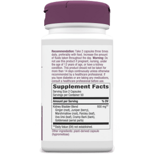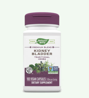 Look to the power of plants to make nature’s wisdom a part of your daily wellness. Nature’s Way Kidney Bladder is a blend of traditional herbs, including ginger root, juniper berry, marshmallow root, parsley, uva ursi, cramp bark, and goldenseal. Serving Size: 2 Capsules Servings Per Container: 16 CapsulesIngredients: Kidney Bladder Blend, Ginger (root), Juniper (berry), Marshmallow (root), Parsley (leaf), Uva Ursi (leaf), Cramp Bark (bark), Goldenseal (aerial parts) Other Ingredients: plant-derived capsule (hypromellose)Directions: Take 2 capsules three times daily, preferably with food.