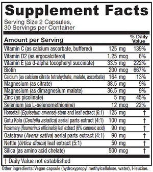 SERVINGS PER CONTAINER: 30INGREDIENTS: calcium ascorbate buffered (Vitamin C), ergocalciferol (Vitamin D2), d-alpha tocopheryl succinate (Vitamin E), Biotin, Calcium (calcium citrate tetrahydrate, malate, ascorbate), Magnesium (citrate), Magnesium (dimagnesium malate), Zinc (picolincate), Selenium (L-selenomethionine), Horsetail stem and leaf extract (6:1), Gotu Kola aerial parts extract (4:1), Rosemary leaf extract (6% camosic acid), Oatstraw aerial parts extract (4:1), Nettle leaf extract, Silica.