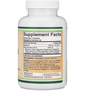 A magnesium blend that combines eight different forms of magnesium, including Magnesium Citrate, Bisglycinate, Taurate, Oxide, Malate, L-Aspartate, Orotate, and Ascorbate, offers a comprehensive and multifaceted approach to meeting your magnesium needs.MAG-8 is a magnesium breakthrough supplement. No other magnesium supplement on the market offers 8 different forms of magnesium in a single pill that also provides 100% of the daily value of elemental magnesium per serving.Double Wood's MAG-8 Magnesium supplement provides 426 mg of elemental magnesium per serving, which is the daily recommended value for adult males.