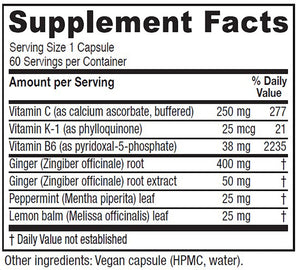 SERVINGS PER CONTAINER: 60INGREDIENTS: Vitamin C (as calcium ascorbate, buffered), Vitamin K1 (as phytolloquinone), Vitamin B6 (as pyridoxal-5-phosphate), Ginger root extract (5% gingerols), Ginger root (Zingiber officinale), Peppermint (Mentha piperita), Lemon balm (Melissa occifincalis)