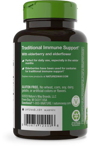 For centuries, black elderberries have been used as a remedy for immune support during the winter months.* The berries are native to Europe and can also be made into liqueurs and cordials due to their sweet-tart taste. Nature’s Way Black Elderberry is inspired by traditional wisdom.*Black Elderberry Does Not ContainGluten, Wheat, Corn, Soy, Dairy, Gelatin, Colors, Artificial Flavors