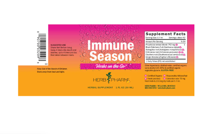 Immune Season comes in an intuitive spray format, making it easier to include herbs in your healthy everyday habits. It includes Black Elderberry prepared from the fully ripened berries of Certified Organic Sambucus nigra trees.Ingredients: Extraction rate 70 mg fresh herb & 233 mg dry herb per 0.7 ml.Certified OrganicBlack Elderberry fruit (Sambucus nigra)Astragalus root (Astragalus mongholicus)Echinacea root (Echinacea purpurea)Eleuthero root (Eleutherococcus senticosus)Responsibly WildcraftedGinger rhizome (Zingiber officinale)Other Ingredients: Distilled water, certified organic cane alcohol (25-35%) & certified organic vegetable glycerin.
