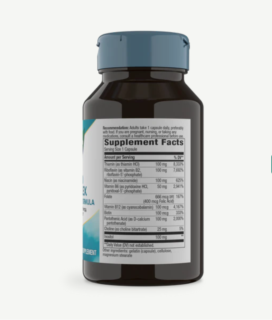 AMOUNT/SERVING%DVThiamine (as vitamin B1)100mg8,333%Riboflavin (at vitamin B2, riboflavin-5'-phosphate)100mg7,692%Niacin (as niacinamide)100mg625%Vitamin B6 (as pyridoxine HCl, pyridoxal-5'-phosphate)50mg2,941%Folate (Folic Acid 400 mcg)666mcg DFE167%Vitamin B12 (as cyanocobalamin)100mcg4,167%Biotin100mcg333%Pantothenic Acid (as D-calcium pantothenate)100mg2,000%Choline (as choline bitartrate)25mg5%Inositol100mg**** Daily Value (DV) not established