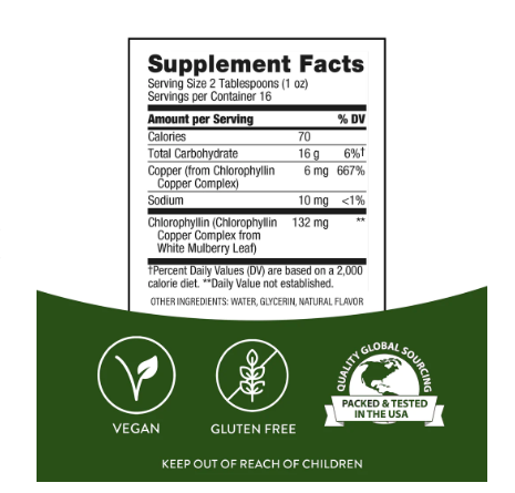 Ingredients: Total Carbohydrate, Copper (from Chlorophyllin Copper Complex), Sodium, Chlorophyllin (Chlorophyllin Copper Complex from White Mulberry Leaf)