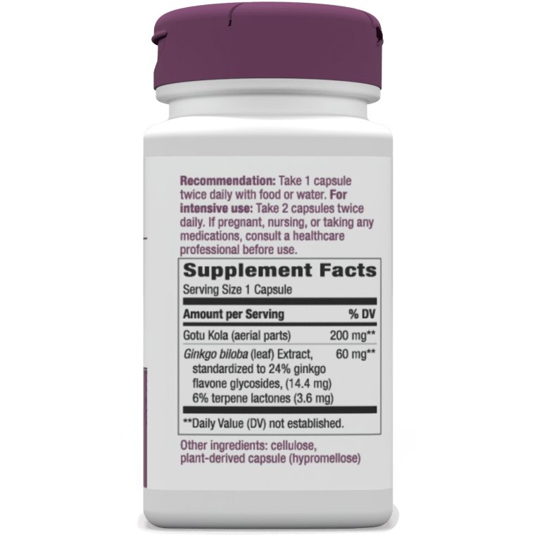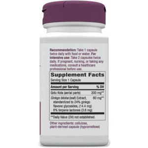 Ingredients: Gotu Kola (aerial parts) 200 mg, Ginkgo biloba (leaf) Extract, standardized to 24% ginkgo flavone glycosides (14.4 mg), 6% terpene lactones (3.6 mg) 60 mg