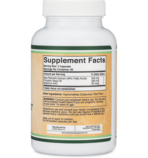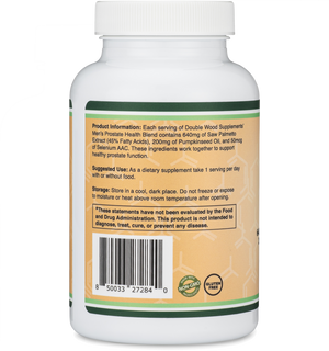 Double Wood's Prostate Support Supplement for Men's Health includes saw palmetto, pumpkin seed oil, and selenium. These ingredients have been clinically studied to support a healthy prostate and healthy urination habits. Taking one serving a day for 30 days may help reduce bathroom trips and improve quality of life for those with prostate problems. Each bottle contains 120 capsules (60 servings of our prostate support formula).