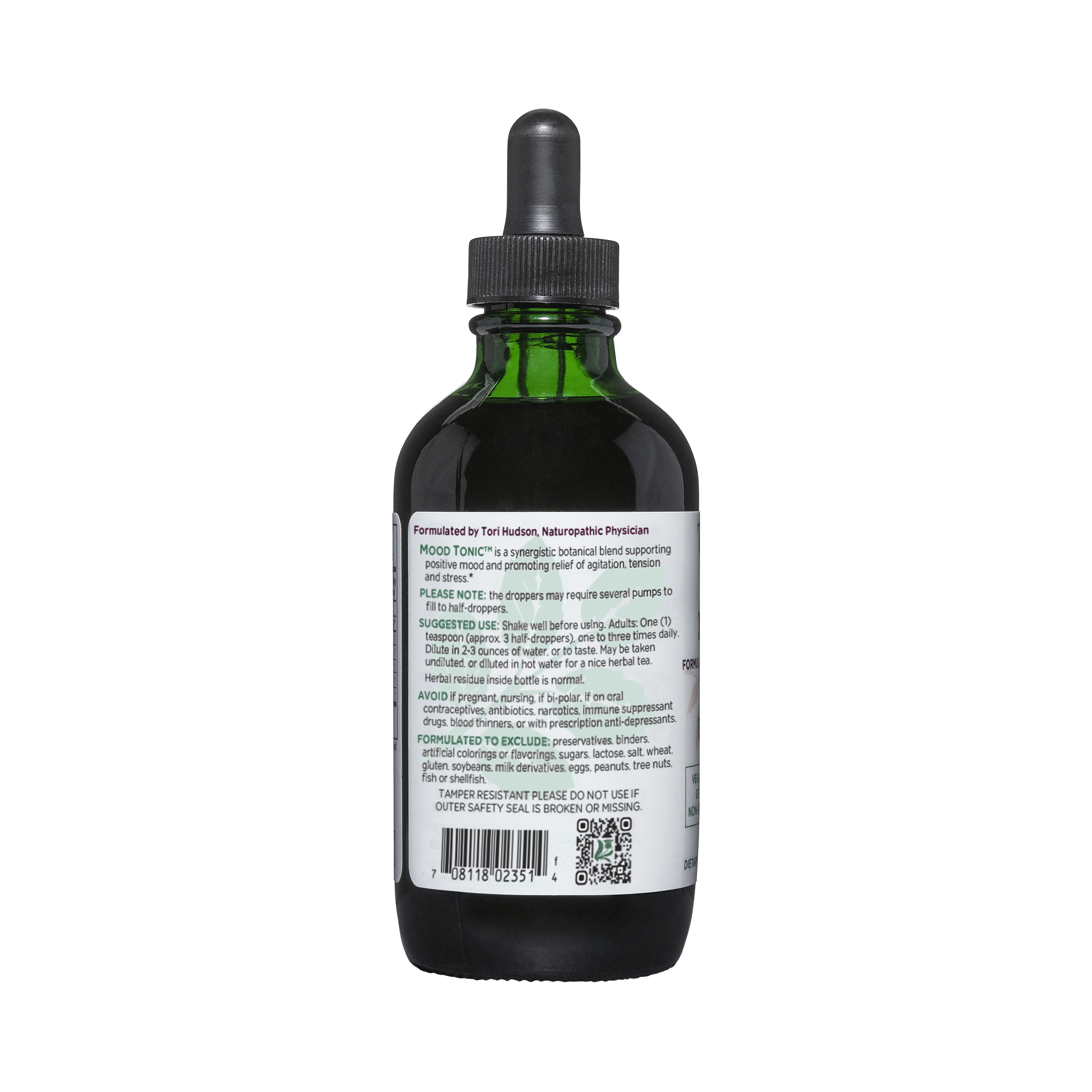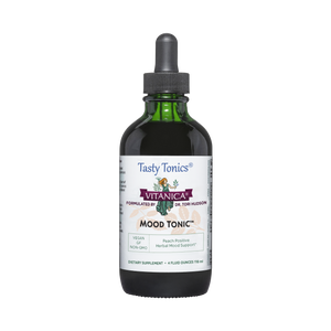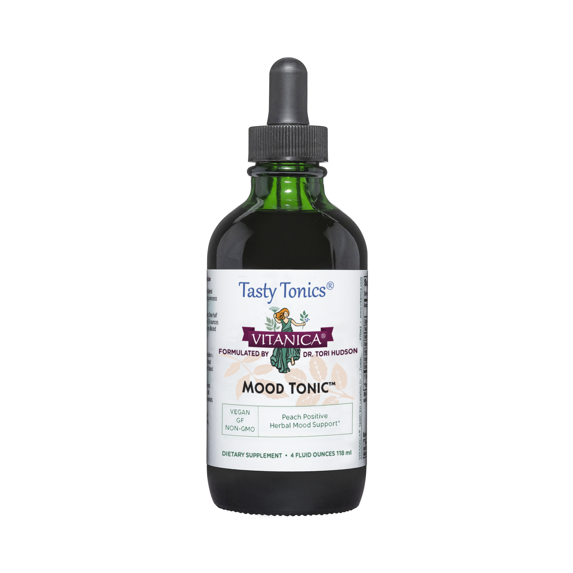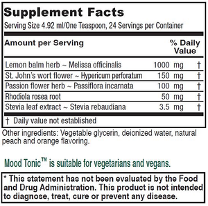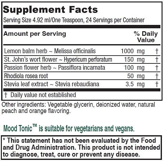 Vitanica Mood Tonic is a synergistic botanical blend supporting positive mood andpromoting relief of agitation, tension and stress.SERVING SIZE: 4.92 ml/One Teaspoon SERVINGS PER CONTAINER: 24INGREDIENTS: Lemon Balm, St John's Wort Flower, Passionflower Herb, Rhodiola, SteviaOther Ingredients: Vegetable glycerin, deionized water, natural peach andorange flavoring.DIRECTIONS: Take 1 teaspoon (3 droppers), up to 3 times daily. Dilute in 2‐3 ounces of warm or cool water, or to taste as a satisfying herbal tea.