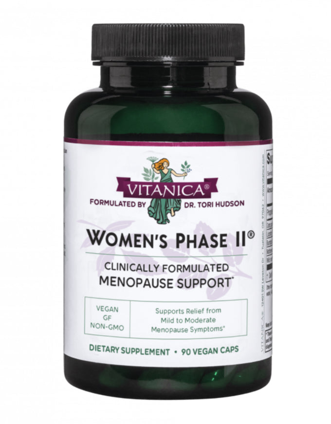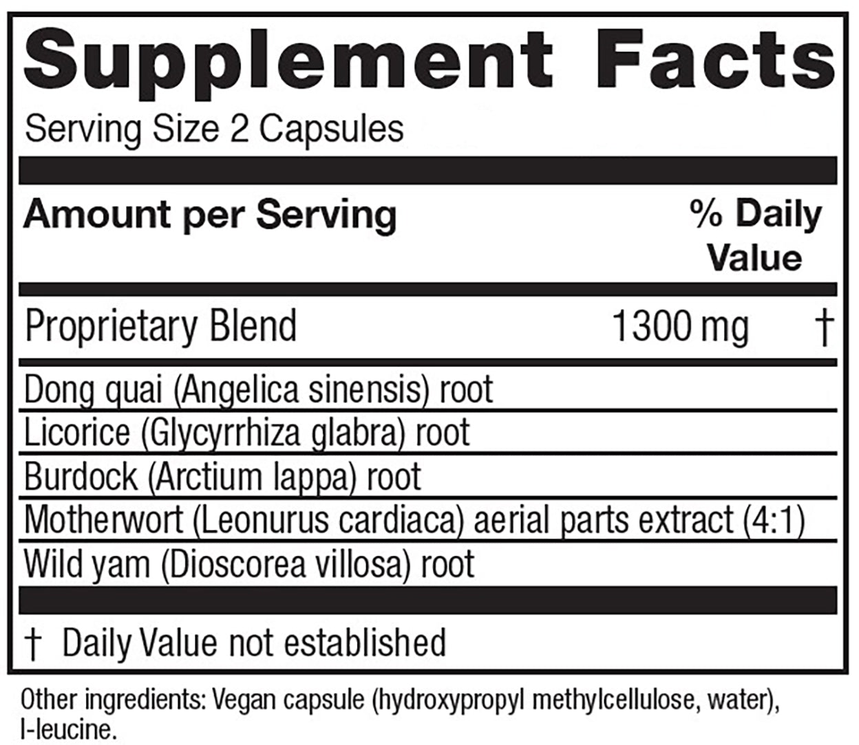 Supports relief from mild to moderate menopause symptoms such as hot flashes, mood changes, sleeplessness and vaginal dryness.Non GMOOrganic and or wild crafted herbsVeganFeatured Ingredients:Studied in a double-blind, placebo controlled study the results of this specific formula were published: 71% of the women reported fewer total symptoms and 100% had a reduction in the severity of symptomsPhytoestrogenic support for menopause and maintenance support for healthy breasts, bone and heart tissues from Licorice root, Dong quai and Wild yam Liver support from Burdock root, which in turn can support the shift in hormone levels menopausal women experience naturallyMotherwort, a time-honored herb for menopausal women, promotes heart and uterine toneSuggested use: 2 capsules, two times daily, or as directed by your healthcare practitioner.Contraindications & Warnings:Avoid this product if you have hypertension, have very heavy menses, are using blood thinning medications, or are pregnant or nursing.
