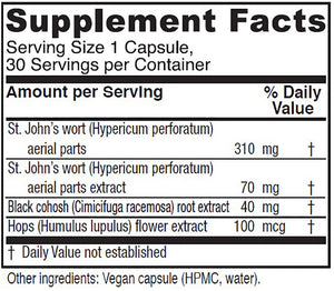 Supplement DescriptionDesigned using more recent research in botanicals for menopause and perimenopause, Woman’s Passage features a simple combination to promote quick relief from menopause symptoms.*Featured Ingredients:St. John’s wort and Black cohosh, as shown in recent research, have a better effect relieving menopause symptoms when used in combination, than when used separatelyThe hops extract in this formula is standardized to a very specific compound, 8-prenyl-naringenin, indicated in research to promote rapid relief for hot flashes and other menopause related symptomsWoman’s Passage can be used in combination with Vitanica’s other menopause products for even better relief from menopause symptoms