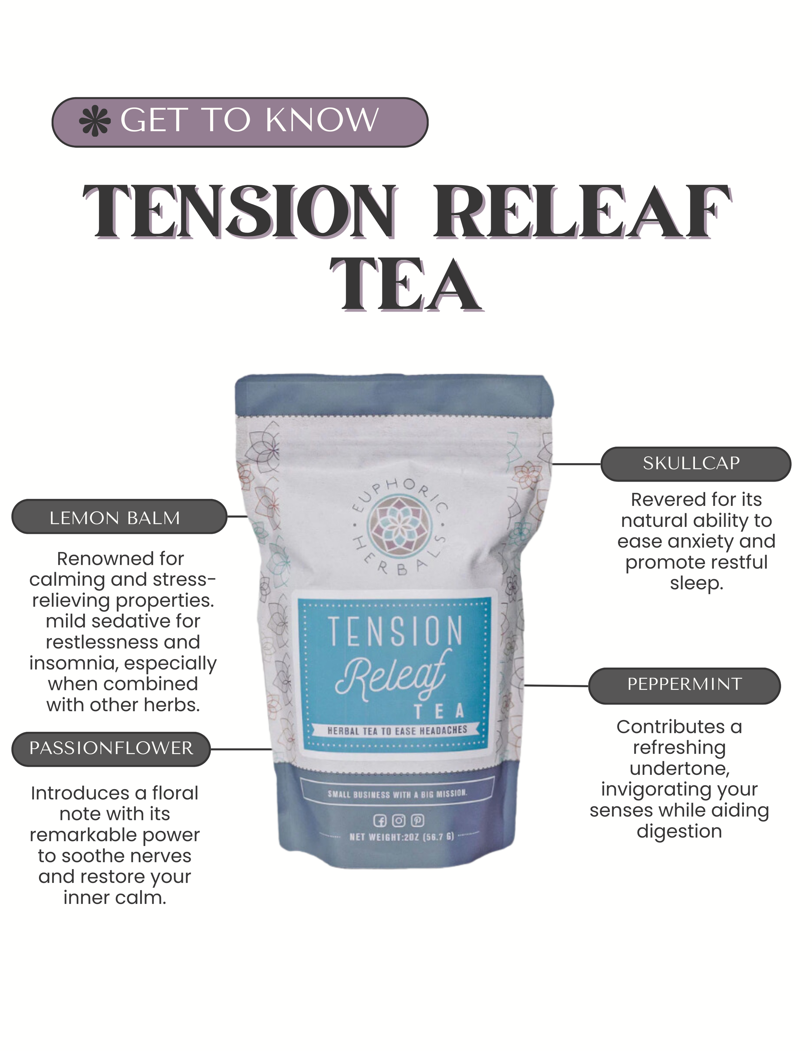 Immerse yourself in the soothing tranquility of Tension Releaf loose herbal tea, your serenity-inducing partner, expertly blended with a handpicked selection of 100% organic ingredients.